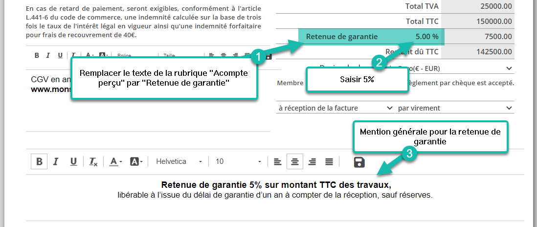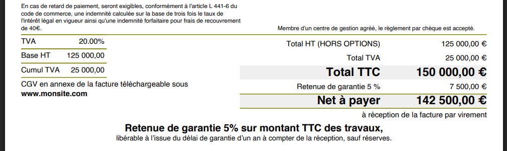 | Le rendu sur votre facture avec retenue de garantie doit ressembler à cela : |