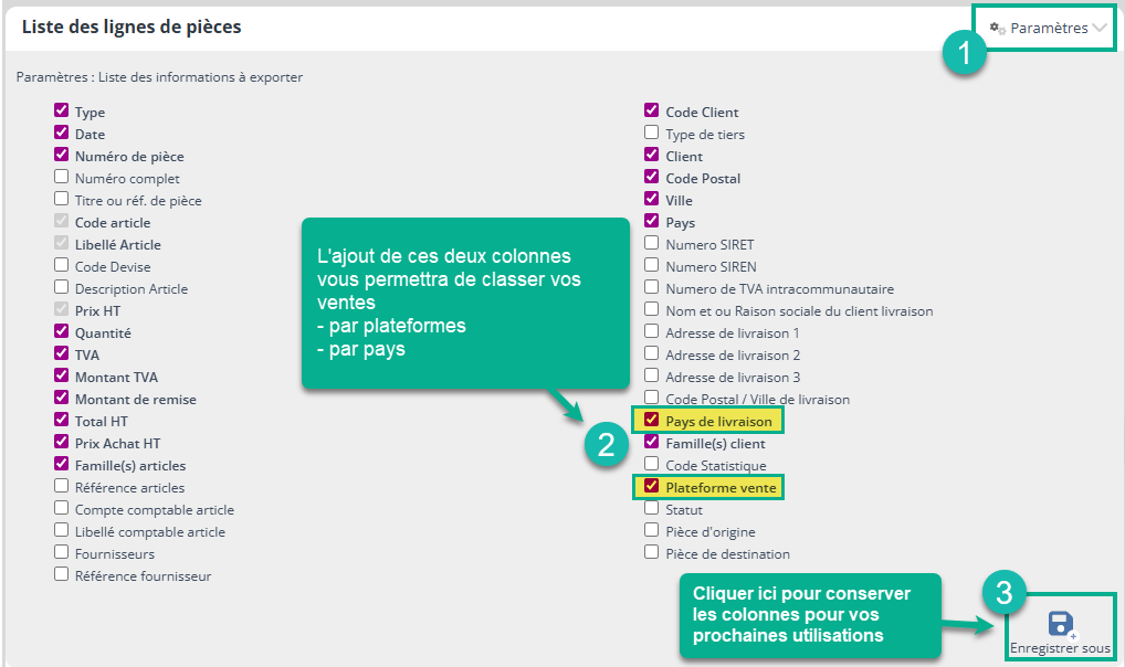 2. Cocher Pays de livraison et Plateforme de vente pour ajouter les colonnes à l’export Excel