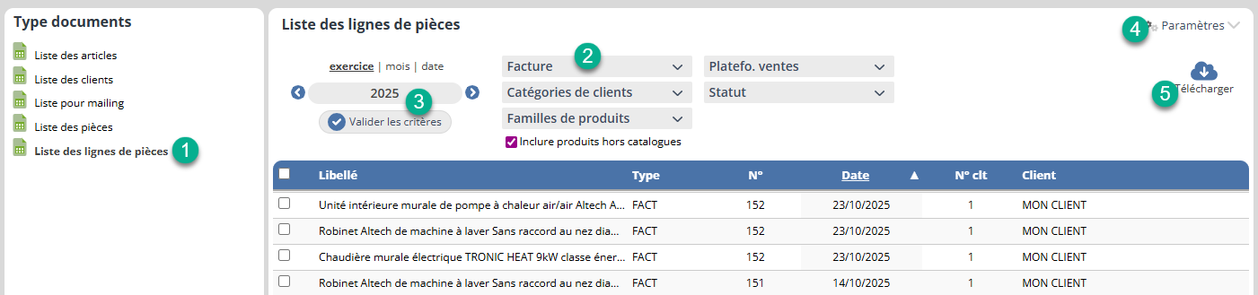 1. Cliquer sur « Paramètres » dans le tableau Liste des lignes de pièces