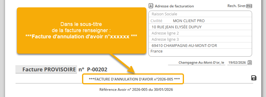 Dans la zone de sous-titre de la facture renseigner :  ***Facture d’annulation d’avoir n°xxxxxx *** avant d’enregistrer et de valider la pièce.