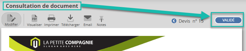 Le statut est indiqué en haut à droite d’un document en cours de consultation. En dehors des factures, le statut d’un document peut être modifié à l’aide d’une liste déroulante en fonction de la situation. |