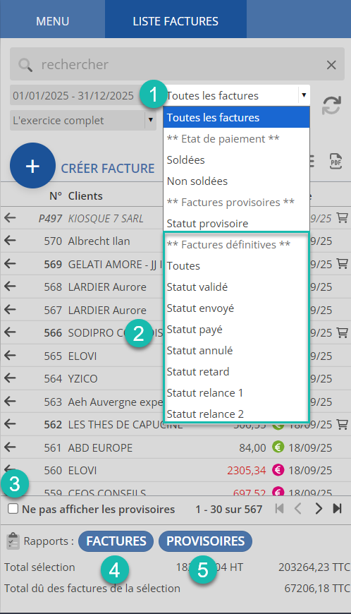 L’intérêt d’un statut est de vous alerter en un clin d’œil de la situation d’une pièce. Il peut parfois être pratique d’isoler un statut pour mieux apprécier une situation. Pour cette raison, un mécanisme de filtre vous permet de n’afficher qu’un statut de facture à la fois.