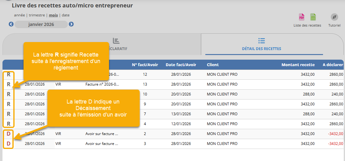 L’onglet DÉRAILS DES RECETTES permet d’accéder à un tableau récapitulatif des différentes recettes enregistrées sur ClicFacture durant la période. La lettre R signifie Recette. Il peut arriver, lors d’un avoir notamment, que vous rencontriez la lettre D pour indiquer un Décaissement. |