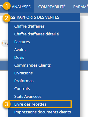 ![]() | Le livre des recettes se situe dans le menu ANALYSES / Rapports des ventes / Livre des recettes de la barre supérieure de ClicFacture.