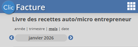 | Il est possible de choisir la période déclarative entre le mois ou le trimestre. Par défaut le mois en cours ou le trimestre en cours sont proposés. Il est aussi possible d’avoir une vision annuelle ou de date à date. Seuls les choix mensuels ou trimestriels seront conservés pour la prochaine utilisation du livre des recettes. | ![]() |