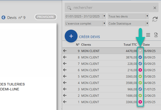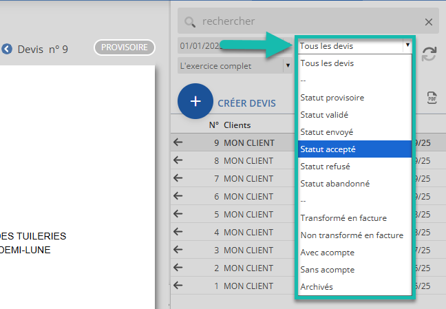 | Il est ensuite possible de filtrer dans la console la liste des devis en fonction de leur statut. |